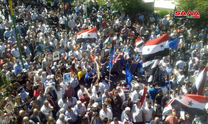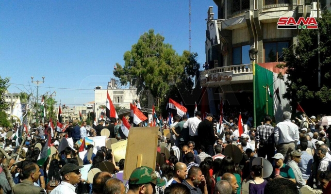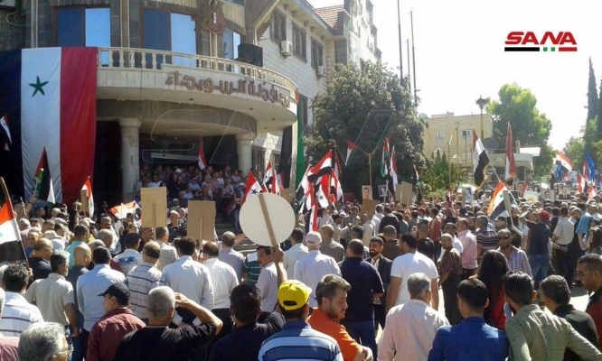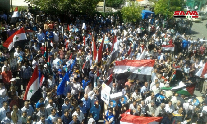 وقفة وطنية جماهيرية أمام مبنى محافظة السويداء رفضاً وتنديداً بالعقوبات الاميركية والإجراءات القسرية المفروضة على سورية