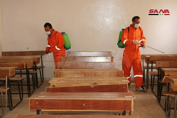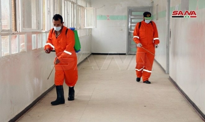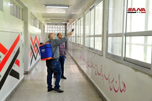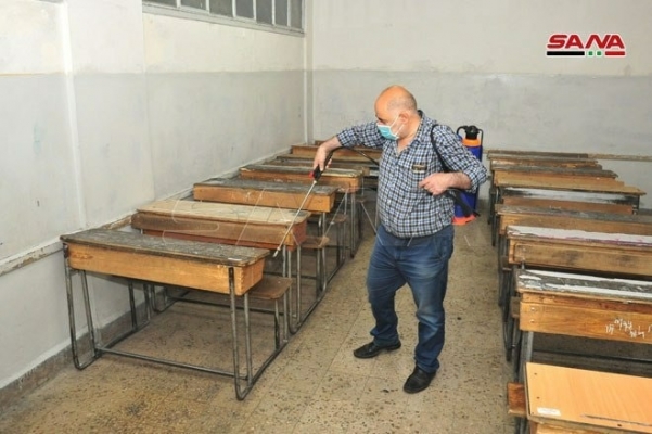 من عمليات تعقيم المدارس في دمشق ودرعا لاستقبال طلاب امتحانات الثانوية العامة بكافة فروعها غداً