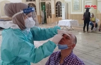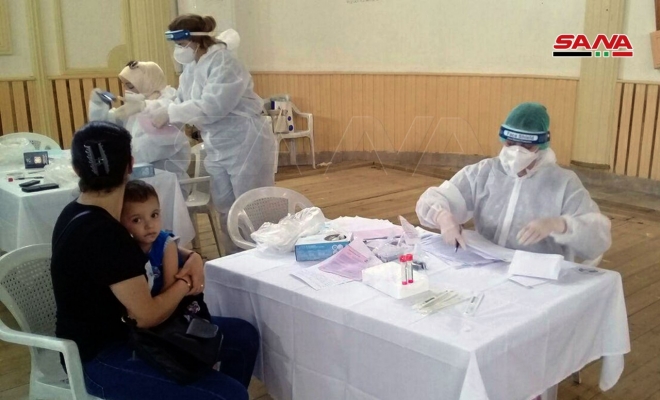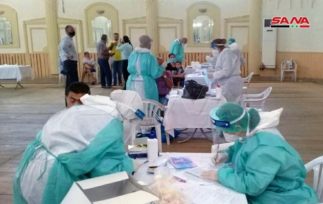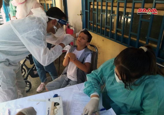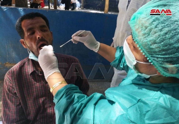 بالصور.. من صالتي الجلاء وتشرين بدمشق.. أخذ المسحات الخاصة باختبار الكشف عن فيروس كورونا (بي سي آر)