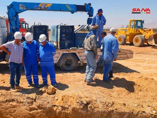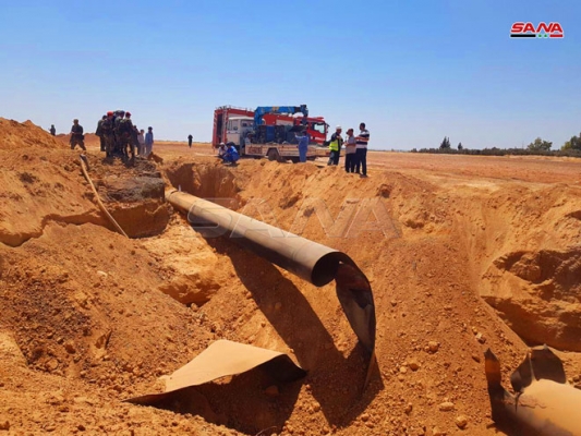 الورش الفنية تبدأ أعمال تأهيل وإصلاح خط الغاز العربي الذي تعرض لتفجير إرهابي فجر اليوم في المنطقة بين عدرا والضمير بريف دمشق.