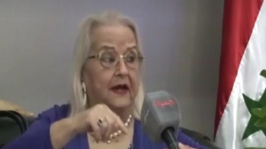 الفنانة انطوانيت نجيب خلال زيارة لجناح أساس للمقاولات في معرض دمشق الدولي