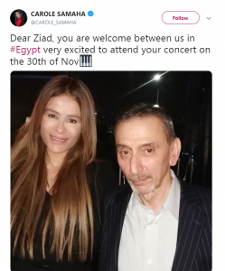 وعلّقت كارول سماحة على المنشور كاتبةً: "عزيزي زياد مرحباً بك فى وسطنا في مصرأنا متحمسة جداً لحضور حفلك في 30 نوفمبر".