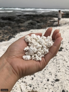 يبدو هذا الشاطئ من بعيد، كأي شاطئ آخر برمال بيضاء ساحرة، ومياه صافية مغرية للسباحة، لكن بمجرد أن تطأه قدماك، سيفاجئك المنظر، فالحصى والرمال أقرب لكونهما حبات ذرة “فشار”.