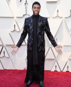 الممثل Chadwick Boseman من فيلم Black Panther، أطل ببذلة من دار Givenchy العريقة، والتي تتميز بسترة من الباييت طويلة من الخلف مع سروال فضفاض.