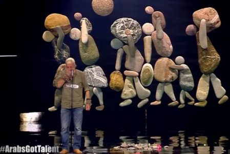 المتسابق السوري كشف لحكام عرب غوت تالنت عن موهبته التي تعتمد على تشكيل الحجر، من خلال استخدام القوالب في إبراز قصة ما، ليقدم على رسم النزوح السوري من خلال تشكيل الأحجار على أشكال عدة أشخاص يحملون أغراضهم وعائلاتهم ويغادرون.