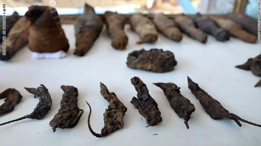 وأشارت وزارة الآثار المصرية على موقعها إلى بقايا آدمية ومجموعة من الطيور والحيوانات المحنطة، التي عُثر عليها في المقبرة ومدخلها أثناء عملية القبض علي أحد العصابات، خلال محاولتها الحفر خلسة في المنطقة الواقعة خارج التل الأثري بمنطقة الديابات.