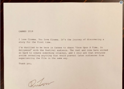 تزامناً مع بدء موعد العرض الافتتاحي الأول لفيلم الدراما والإثارة المرتقب "حدث ذات يوم في هوليوود" في مهرجان كان السينمائي في دورته المقامة حالياً، وجه مخرج الفيلم كوينتين تارانتينو رسالة إلى جمهوره من الحاضرين في المهرجان، لمناشدتهم بالحفاظ على سياج من السرية حول أحداث الفيلم.