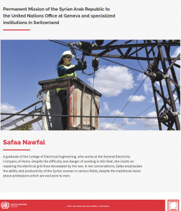 إختارت منظمة الأمم المتحدة وفي يوم العمّال العالمي مهندسة الكهرباء السورية صفاء نوفل لتكون ضمن إحدى السيدات اللواتي عُرضت قصصهن في معرض عالمي تحت عنوان "ليست مهنة امرأة" كنموذج للمرأة السورية العاملة التي تخوض مع الرجل أصعب المهن.