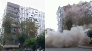 لحظة انهيار أحد المباني جراء الزلزال الذي ضرب إزمير في تركيا